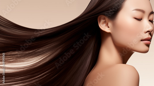woman, beauty, hair, asian, beauty care, hair care, face, model, fashion, eye, person, glamour, brunette, closeup, people, skin, lady, smile, make-up, sensuality, studio, head, lip, 1, coiffure, long, skincare, long hair, profile