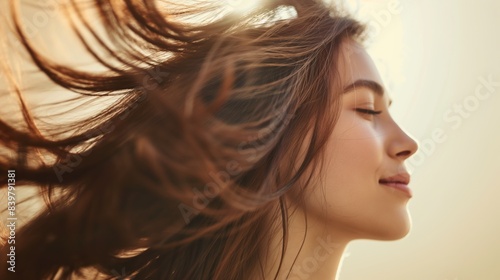 woman, hair, brown, sun, summer, warm, smile, enjoying, outdoors, wind, light, skin, face, eye, closed, natural, beauty, happy, relaxation, peaceful, serene, freedom, carefree, sunshine, gentle, breeze, closeup, portrait, day, afternoon, soft, aethereal, photo, image, photo, model, fashion, coiffure, glamour, make-up, brunette, make-up, long, lady, smiling, people, closeup