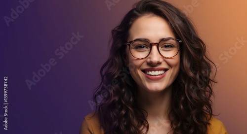 Woman with curly hair smiling in round glasses against purple and orange gradient background. Authentic beauty and joy. Professional concept for intellectual lifestyle and education