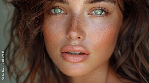 woman with dark green eyes, well-defined eyebrows, full lips, long brown hair