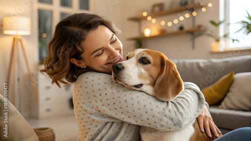 woman with dog, Woman hugging her dog indoors, emotional pet lifestyle concept