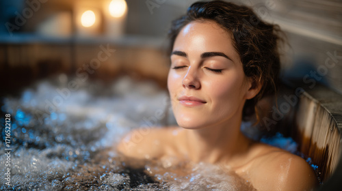 Woman with eyes closed immersed in ice bath, wooden tub texture visible, spa lighting creating soft reflections on water, relaxation and recovery concept