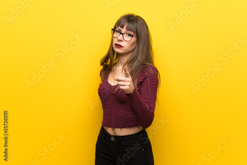 Woman with glasses over yellow wall frustrated and pointing to the front