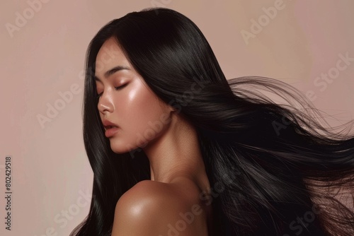 woman with long thick glossy shining dark hair, studio portrait of brunette female with natural healthy hair on plain background, hairdresser salon, hair product ad concept