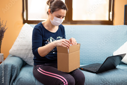 package, order, woman, shopping, delivery, infected, virus, pandemic, box, mask, room, client, purchase, home, shopper, cyberspace, buy, shipping, open, person, cardboard, lifestyle, online, sofa, receiving, happiness, delivering, discount, living, receive, satisfaction, laptop, pack, hand, cardboard box, sale, female, smiling, opening, retail, buying, quarantine