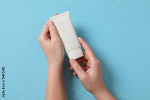 Woman with tube of hand cream on light blue background, top view