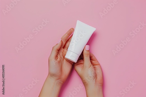 Woman with tube of hand cream on pink background top view. Space for text