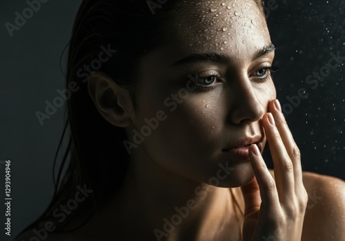 woman, droplet, face, beauty, emotion, portrait, skin, close, up, natural, introspection, lighting, glistening, expression, serene, calm, aesthetic, skincare, model, fresh, clean, moisture, health, feminine, gaze, thoughtful, elegant, charme, youthful, radiant, shine, calmness, softness, delicate, feature, artistic, photo, lifestyle, inspiration, wellness, care, refreshment, purity
