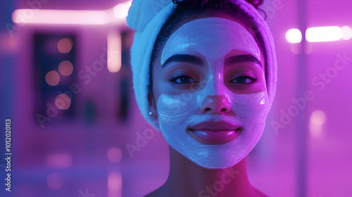 portrait, beautiful woman, skincare, beauty, happy woman, neon, purple, face, natural beauty, glow, treatment, light, white, salon, skincare, closeup, woman, mask, blue, pink, spa, facial