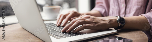 Woman working on laptop computer panoramic banner, female hands typing keyboard closeup, businesswoman or student girl using laptop at cafe