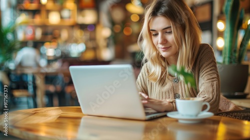 woman, working, laptop, with, hot drink, beside, cafes, computer, business, businesswoman, student, people, person, office, sitting, cyberspace, eatery, technology, table, smiling, beauty, smile, 1, reading, using, teenage, indoor