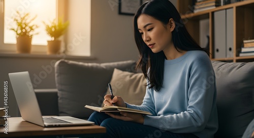 woman, writing, casual attire, calm, living room, studying, notebook, sweater, relaxed, shelf, laptop, pen, book, window, couch, daylight, indoor, learning, asian, document, black hair, table, office, fern, cushion, folder, plant, interior, furniture, technology, student, cognition, note, education