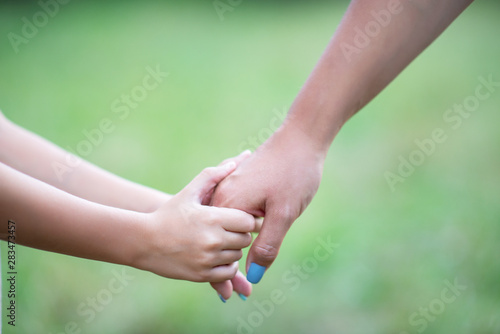 Woman's and kid's hands. Mother leads her child, summer nature outdoor. Parenting, togetherness, help, union, childhood, trust, family concept.