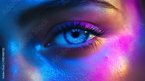 woman, eye, closeup, make-up, neon, lighting, colourful, abstract, skin, face, beauty, fashion, artistic, vibrant, dramatic, texture, cosmetic, glamour, style, portrait, intense, gaze, expression, light, glow, high-coloured, iridescent, eyeshadow, lash, macro