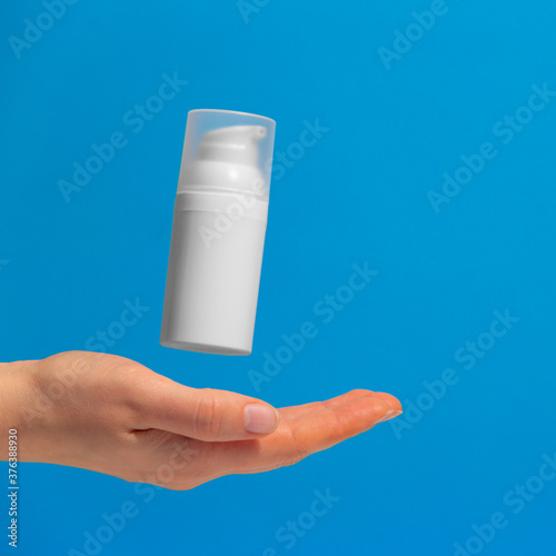 Woman's hand with floating cosmetic product without brand, free space for text. Making advertisement for sunblock moisturizer.