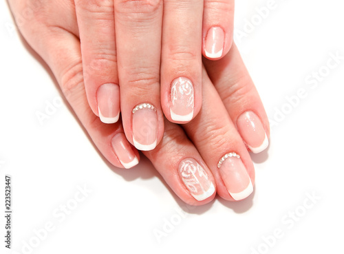 manicure, french, nail, hand, fashion, design, pink, art, polish, gem, sparkle, trend, salon, closeup, nail polish, bright, flower, treatment, beautiful, elegant, care, finger, female, lifestyle, manicured, palm, woman, skin, girl, decor, style, isolated
