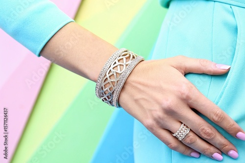 Woman's wrist with silver bracelet and ring against pastel background in fashion advertisement style image