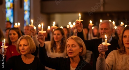 Women and man holding lit candle during a church service, worshiping and praying in a spiritual moment. Festive Christmas Eve or holiday celebration.