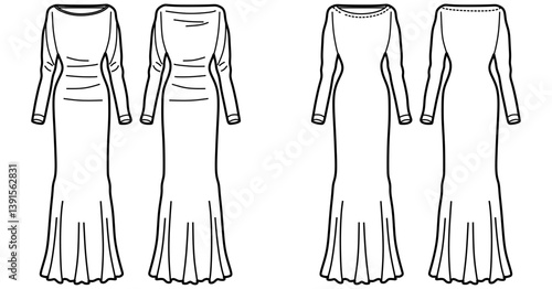 Women column dress design flat sketch fashion illustration with front and back view, long sleeve boat neck mermaid dress drawing vector template