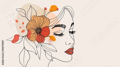 Women face in one line art style with flowers and leaves.Continuous line art in elegant style for prints, tattoos, posters, textile, cards etc. Beautiful woman face Vector illustration