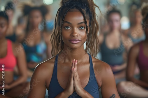 Women of various backgrounds come together in a yoga class to learn stress-relieving techniques from an instructor. Concept Yoga Class, Stress Relief, Diversity, Women Empowerment, Mindfulness