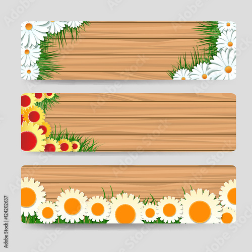Wood horizontal banners template with grass and flowers. Vector illustration