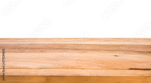 Wood table top isolated on white background. Brown wooden desk empty counter. Copy space for text and ideal for product placement with cut out.