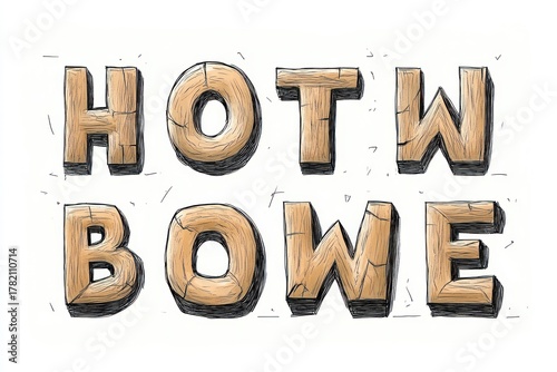 Wood textured 3D block letters arranged in two rows with letters spelling 'HOTW' and 'BOWE' in hand-drawn style