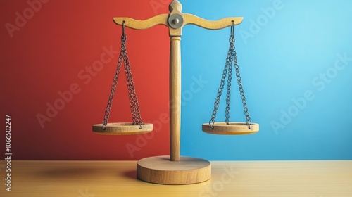 Wooden balance scale on a two color background, symbolizing justice, fairness, and equality in various contexts