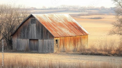 barn, field, dry grass, rolling hills, tree, bare trees, winter, autumn, rural, landscape, exterior, building, architecture, country, countryside, structure, farm, farmhouse, wood, rust, colours, haze, sky, daylight, door, wooden door, sliding door, wall, wooden wall, plank, weathered, texture, surface, facades, front, window, ventilation, rural scene, natural light, sunlight, golden light, warm tones, brown, tan