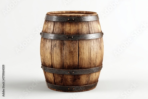 barrel, wooden, vintage, rustic, standing, upright, studio shot, white background, kitchen, bar, brewery, storage, craftsmanship, agriculture, alcohol, beverage, drink, wood grain, heritage, timber, craft, artisanal, home decor