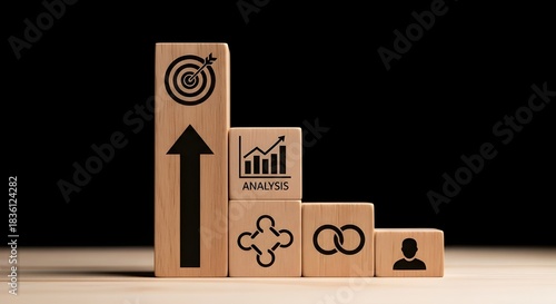 wooden, block, step, growth, business, goal, target, arrow, upward, chart, graph, analysis, datum, process, connection, link, team, person, strategy, success, progress, development, concept, symbol, planning, management, achievement, improvement, career, corporate, marketing, finance, diagram, structure, toy, building, foundation, direction, result, performance