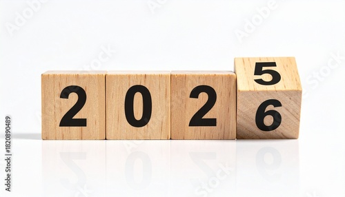 block, wood, year, date, 2025, 2026, flip, rotate, change, transition, time, calendar, countdown, new year, future, past, present, digit, number, typography, concept, symbolic, reveal, motion, dynamic, design, minimal, clean, neutral, background, grey, red, contrast, bold, visual, idea, celebration, shift, update, progress, milestone, moment