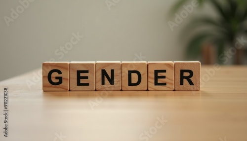 Wooden blocks spelling the word 'GENDER' on a wooden surface with a blurred plant in the background.