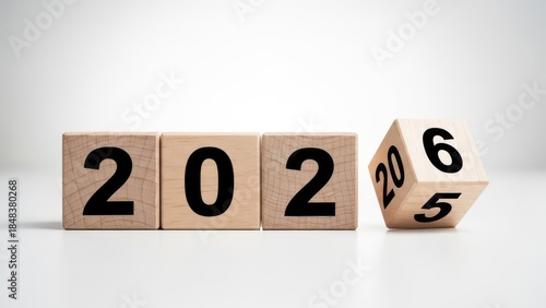 2025, 2026, new year, transition, change, year, block, wooden, cube, number, turning, rolling, dice, forward, progress, concept, future, time, passing, calendar, celebration, end, beginning, white background, clean