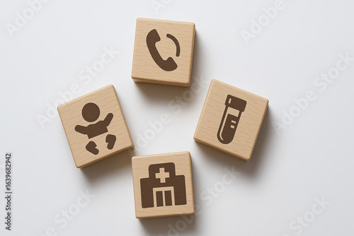 Wooden blocks with baby, phone, test tube, and hospital icons symbolize healthcare benefit and support for child health and medical services in clean setting