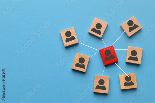 Wooden blocks with people icons connected by lines