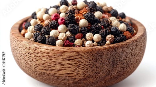 Wooden bowl filled with colorful peppercorns.