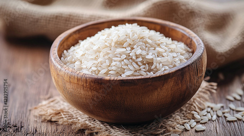 Wooden Bowl Filled with Rice: A simple, yet comforting, image of uncooked rice, perfect for showcasing staple foods or healthy eating.