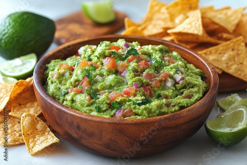 Wooden bowl of guacamole, with chips, avocado, and lime on a light surface. Perfect for food blogs, menus, or healthy eating and snack content.