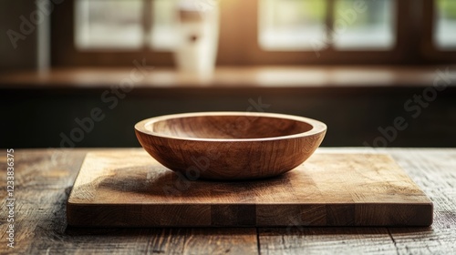 wooden, bowl, cutting, board, soft, natural, light, highlighting, empty, interior, ample, copy, space, creative, text, placement, kitchen, decor, food, rustic, design, photo, still, life, naturalism, tableware, utensil, aesthetic, organic, environment, surface, minimal, simplicity, warmth, texture, artisan, handcraft, environmentally friendly, kitchen utensile, composition, gastronomic, culinary, shadow, illumination, background, prop, presentation, styling