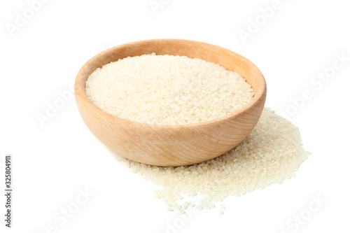 Wooden bowl with rice isolated on white background