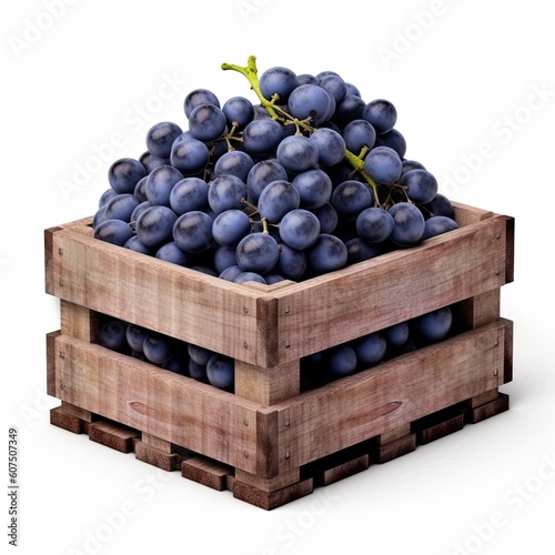 Wooden box with blue grapes isolated on white background, closeup, generative AI