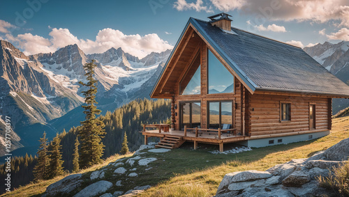 Wooden cabin overlooking stunning mountain scenery at sunset