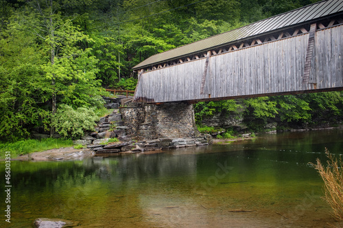 Wooden covered bridge spanning a calm river, letting out on a road in a dense green forest. Peaceful rural scene in New York State.