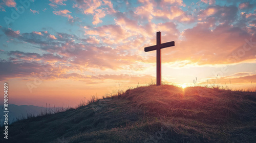 Wooden cross on a hill at sunrise against a colorful sky, conveying easter faith, hope, resurrection and spiritual reflection