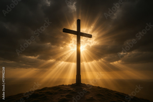 Wooden cross standing on hilltop under dramatic sky with radiant golden sun rays bursting through clouds, symbolizing salvation, hope, and the glory of Christ’s sacrifice