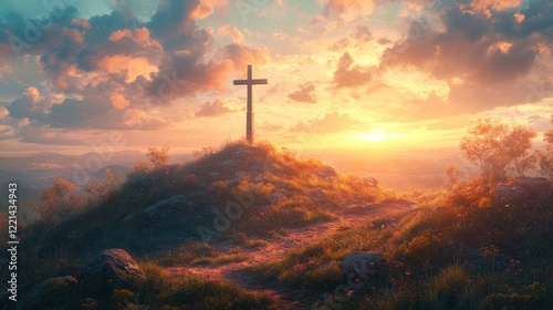 cross, sunset, hill, sky, cloud, nature, peaceful, spiritual, serene, hope, faith, belief, religion, landscape, gold, orange, sun, horizon, mountain, path, grass, tree, rock, divine, tranquil, calm, beauty, heaven, light, glow, ray, summer, evening, twilight, colours, scenic, vista, hilltop, scene, view, jesus christ, church, god, religious, symbol, crucifiction, silhouette, catholic, resurrection