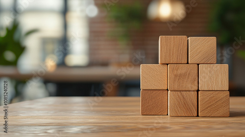 Wooden cubes arranged in row on table create warm, inviting atmosphere. blurred background adds depth, enhancing focus on natural texture of wood