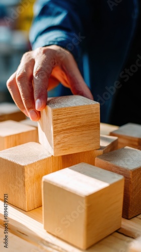 block, human resources, closeup, person working, finger, touch, holding, arrangement, structure, organisation, planning, development, progress, mental health, well-being, leadership, stability, empowerment, motivation, mindfulness, support, balance, strength, sharpened, selective focus, bright light, blurred background, vertical, copy space